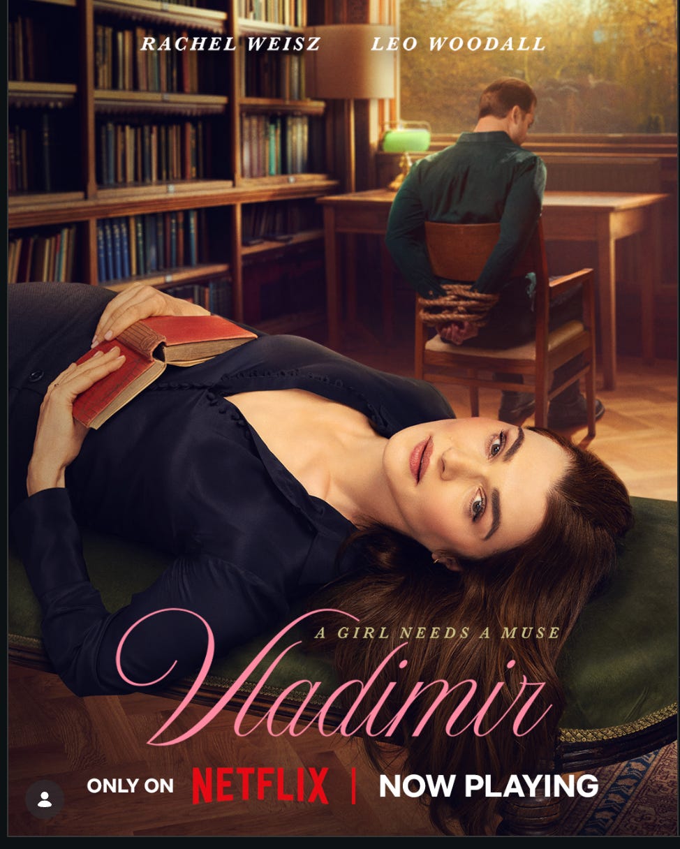 The subtext here is that fretting about the morality of infidelity is at best beside the point and at worst an indication of antifeminist misogyny. (We witness a classroom discussion of Edith Wharton’s House of Mirth as a parable of sexual repression, which of course it is—among other things.) I’m mindful that I’m a guy who recently posted a positive review of How to Make a Killing, which treats murder as a comic premise, and will soon post the final installment of a series on The Sopranos, about a charismatic mobster. Given these two bookends, moralizing about extramarital affairs seems myopic, if not hypocritical. But in those cases, there is at least some unease about bad behavior, whether on the part of the characters themselves or in the moral architecture of the stories, which grapple with the extent to which crime pays. But in Vladimir, we’re presented with a protagonist who does some truly appalling things—beginning with the opening scene of the series, a flash-forward in which we see that she has chained her love object to a chair against his will—with nary an acknowledgment that she’s really done anything wrong while breaking the fourth wall to explain the contours of her inner life.